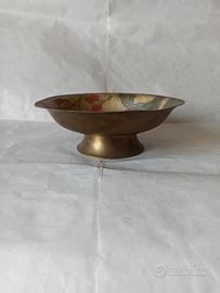 Coppa in ottone dipinta a mano anni '50 - 60 decorazioni con uccelli piante e fiori H. cm. 7 diametro cm. 20 In buono stato di conservazione