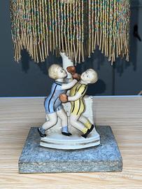 Coppia Abat jour in ceramica tipo Lenci. Base in marmo. Ventola in seta con perline in vetro colorato pendenti.
