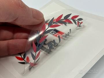 Coppia di adesivi personalizzati stampati su pellicola trasparente con inchiostro di fondo bianco (per poter essere applicato e visibile su qualsiasi tipo di colore di carrozzeria scura)