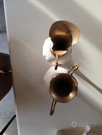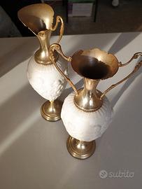 anfora in porcellana con disegni in rilievo di angeli , base e collo in argento/ottone