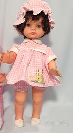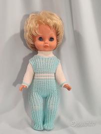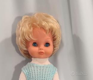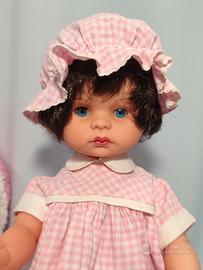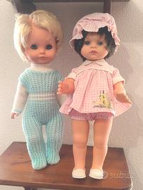 Vendo ad un piccolo prezzo una deliziosa coppia di bambole vintage degli anni 60/70, una marcata MIGLIORATI ed una senza marchio visibile, sono usate ma in buone condizioni. La bambola mora è alta cm. 36 circa e ha il marchio Migliorati sul collo, è in vinile ed indossa il suo completino originale: cuffietta, coulotte e camicina tutto in cotone bianco e rosa e ha scarpette bianche in plastica. La bambola bionda è senza marchio, misura cm. 35 circa ed indossa gli abiti originali: una deliziosa tutina in lana bianca e celeste. Le bambole hanno entrambe capelli ben radicati, morbidissimi, lucidi e non li perdono; il colore del vinile roseo e stabile alla luce, gli occhi azzurri richiudibili. Le bambole sono in ottime condizioni con normali segni d’usura del tempo, sono pulite e igienizzate completamente ma faccio presente che la più piccola quella senza marchio ha un occhio leggermente pigro. GUARDATE LE FOTO PER UNA MIGLIORE DESCRIZIONE.