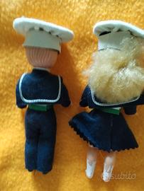 le bamboline muovono le braccia, aprono e chiudono gli occhi. abiti in pannolenci blu, cappelli di colore bianco. cinture in nastro con i colori della bandiera italiana. il corpo è di plastica, leggermente sbiadita la pittura di uno stivaletto della bimba. altezza cm. 15. Anni 60/70 condizioni buone