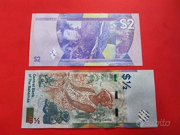 Da mia raccolta vendo coppia di banconote da collezione zona Caraibi, 2 Dollari del Belize del 2025 e ½ Dollaro delle Bahamas del 2019. In perfetto stato di conservazione