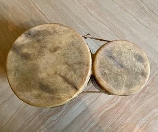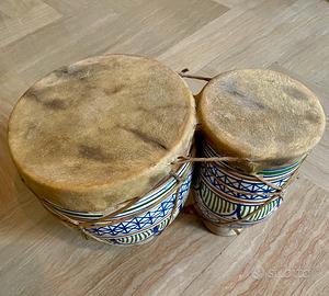 Vendesi bongo africano a due suoni vintage in ceramica e pelle di capra, decorato a mano.
