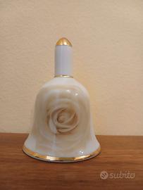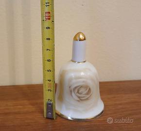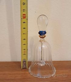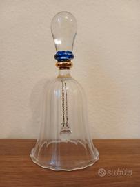 Vendo insieme o singolarmente una coppia di campane di collezione: Una campana decorativa in vetro soffiato, realizzata in vetro trasparente, con un bordo inferiore smerlato e manico in vetro, con un elemento decorativo blu e altro dorato. All'interno è visibile un batacchio, appeso ad una catenella sottile, che le consente di suonare, producendo un suono meraviglioso. L'altra campana in porcellana decorativa, dipinta a mano, prodotta a Limoges, in Francia. Porcellana francese autentica, decorata con accenti in oro 22k. Misure nelle foto. Prezzo riferito alla coppia.