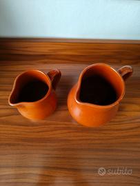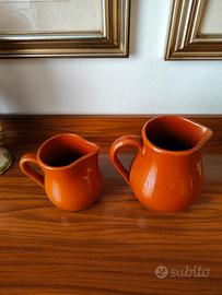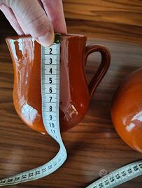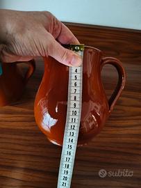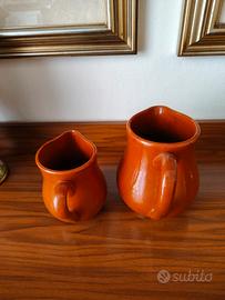 Brocche in terracotta smaltata, elementi tipici dell'artigianato rustico mediterraneo. Il colore marrone-aranciato e la finitura lucida sono caratteristici dei prodotti realizzati a mano in argilla e poi cotti con una vetrina protettiva. Sono vintage anni '70. Ideali per acqua e vino o per bevande come sangria e sidro. Terracotta ceramica smaltata, apprezzata per la sua resistenza e per la capacità di mantenere fresche le bevande. Dimensioni nelle foto.