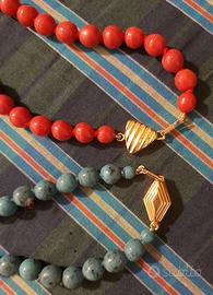 Le sfere imitano il corallo rosso e le pietre turchesi e sono annodate a mano l'una all'altra con filo tono su tono come si fa con le pietre autentiche.