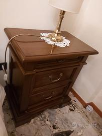 coppia comodini stile classico (circa 1990/2000) in legno color noce con maniglie in ottone brunito.