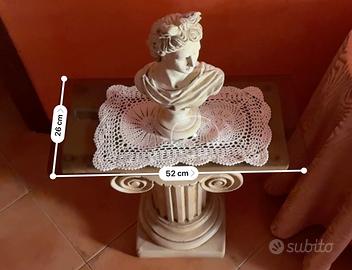 Vendesi esclusiva coppia di consolle decorative in perfetto stile Neoclassico / Hollywood Regency, risalenti alla seconda metà del '900. * Le Colonne (Basi): Due splendide colonne con capitello ionico a volute, realizzate in solido materiale composito (polvere di marmo/scagliola) color travertino/crema. Le basi rettangolari sono molto stabili e presentano una raffinata finitura patinata "antichizzata". * I Piani: Due piani in vetro fumé di forma rettangolare (52×26 cm ciascuno), appoggiati in sicurezza su gommini antiscivolo. * I Busti: Due sculture classiche speculari raffiguranti un giovane nobile (stile Apollo/Alessandro Magno), con ottima resa dei dettagli del volto e della capigliatura. * Dimensioni (per ogni singolo set): Piano in vetro: 52×26 cm. Base colonna inferiore: 25×25 cm. Base superiore: 48x21cm circa. Altezza totale busto: 34 cm. * Stato di conservazione: Entrambi i set sono in condizioni eccellenti. I vetri sono integri senza graffi evidenti. La finitura delle colonne e dei busti presenta la patina originale, volutamente "antica" per un fascino vintage autentico.