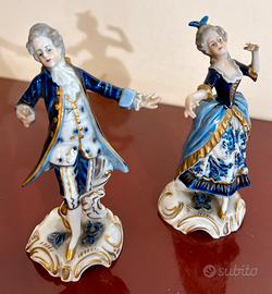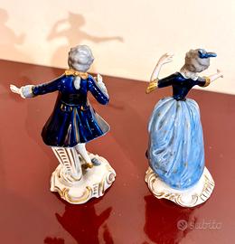 Tutti i collezionisti e gli intenditori di porcellane conoscono la Aelteste Volkstedter Porzellanmanufaktur 1762, la più antica fabbrica in Turingia e la più rinomata per la qualità straordinaria, l'eleganza delle sue porcellane fatte a mano, la cura artigianale, l’attenzione ai dettagli che rendono ogni pezzo una vera opera d’arte preziosa e ricercata. Vendo le due splendide figure in foto, si tratta di una coppia danzante in abiti rococò su base rocaille. Possono essere un perfetto regalo ricco di fascino. Sono porcellane policrome dipinte a mano con doratura ornamentale. Come tutti i pezzi autentici Aelteste Volkstedt sono marchiate e numerate. Risalgono alla prima metà del ‘900, l’altezza è 12 cm e le condizioni sono perfette, tranne la punta mancante dell’indice destro di lei come si può notare ingrandendo la foto. Furono acquistate nella celebre gioielleria Leonardo Gaito di Napoli. Le vendo singolarmente o in coppia. Il prezzo indicato è per la statuina singola, in caso di acquisto della coppia sconto del 10%.