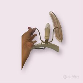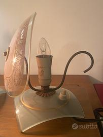 Coppia di lampade abat jour Anni 50 in vetro satinato e smaltato nei toni delicati del rosa e del verde, finemente incisi con decoro a motivo floreale. La struttura in metallo brunito, dal profilo sinuoso ed essenziale, sostiene i diffusori creando un raffinato gioco di luci e riflessi.