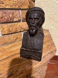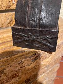 Coppia di alari antichi in ghisa dei primi '900-origine francese-personaggi con turbante(tipo Lawrence d'Arabia) e stemma frontale con fucili a baionetta,incrociati.