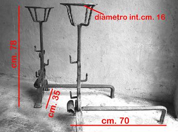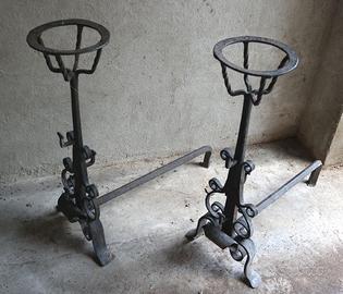 Coppia di vecchi alari da camino – porta ceppi in ferro battuto.