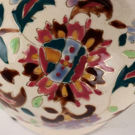 antimonio dorato. Decoro floreale policromo sul corpo globulare.