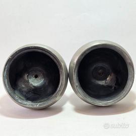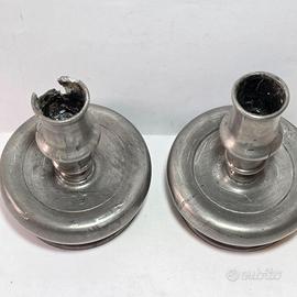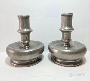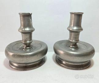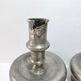 Coppia di antichi candelieri in peltro con base circolare a campana e patina originale. Base con vari lavori di tornitura nella quale è incassato il fusto anch'esso tornito con si allarga dal basso verso l'alto Uno è in ottimo stato con solo abrasioni di pulitura, uno invece presenta una rottura nell'innesto con la candela. Misure: 14.2 h x 12.5 cm diametro circa. antiquariato scultura statua busto bronzo marmo ceramica dipinto quadro pittura arte antica olio su tela telaio cornice dorata legno intagliato mobili antichi armadio specchiera originale raro collezione restaurato autentico decorazione d'epoca antiquités première sculpture statue buste marbre céramique tableau peinture huile sur toile cadre doré bois sculpté meubles anciens armoire miroir rare collection restauré authentique décoration d’époque Antiquitäten altes e Skulptur Büste Marmor Keramik Gemälde Kunstwerk alte Kunst Öl auf Leinwand antiker Rahmen vergoldet Holz geschnitzt antike Möbel Schrank Spiegel selten Sammlung restauriert authentisch Dekoration aus der Zeit antigüedades escultura estatua bronce mármol cerámica cuadro pintura óleo sobre lienzo marco dorado madera tallada muebles antiguos armario espejo colección restaurado auténtico decoración de época antiques bust bronze marble ceramic painting artwork old oil on canvas frame gilded carved wood antique furniture wardrobe mirror restored authentic period decoration silver plata argento vetro vaso glass vase vitrio 400 500 600 700 800 900 liberty déco barocco neoclassico rinascimento gotico classico impero legno madera wood Luigi XVII XVI XV XVIII XIX XX