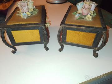 Coppia di antichi cofanetti portagioie con struttura in ferro battuto, e applicazioni in tessuto e porcellana