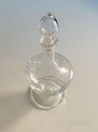 Coppia di bottiglie in vetro vintage anni ’50, entrambe incise con eleganti decorazioni. Ogni bottiglia ha il suo tappo in vetro originale e dettagli unici: simili nello stile, ma con motivi e tappi diversi. Ideali per collezionisti o come oggetti decorativi in stile retrò.