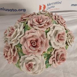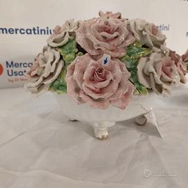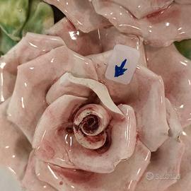 Coppia di bouquet di rose bianche e rosa in porcellana, inseriti in vaso bianco