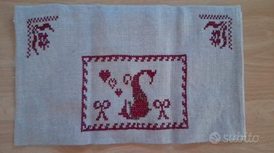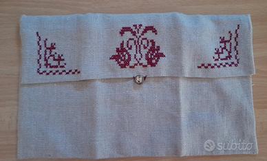 Busta in lino rustico con punto croce: lino a trama naturale con ricamo a punto croce bordeaux, interno con taschina chiusura velcro, chiusura con bottone gioiello dorato. Dimensioni 31 cm x 19 cm