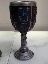 Esclusiva coppia di calici da collezione, perfetti per amanti del genere fantasy, gotico o per arricchire una serata a tema. Calice Pirata: Presenta decorazioni in rilievo che raffigurano un pirata con bandana rossa e sciabole, incastonato in una struttura che richiama una botte di legno. La base è impreziosita da gemme rosse incastonate. Calice Medievale/Cavaliere: Decorato con uno stemma araldico blu con gigli dorati, avvolto da un motivo a catena sullo stelo, evocando atmosfere da crociata e antichi regni. Materiali: Realizzati in resina di alta qualità finemente lavorata e dipinta a mano per l'esterno, con inserto interno in acciaio inossidabile estraibile per una facile pulizia. Dimensioni: Altezza circa 17 - 18 cm. Condizioni: Ottime, ideali sia come oggetti decorativi che per uso reale (si consiglia il lavaggio a mano dell'inserto in metallo). Ideali come regalo originale, per giochi di ruolo o come pezzi d'arredamento unici per la tua vetrina.