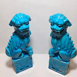 Coppia di Cani di Foo cinesi in ceramica azzurra, maschio e femmina, risalente alla seconda metà del XX secolo.