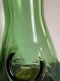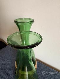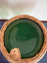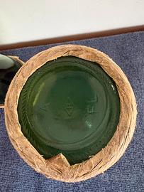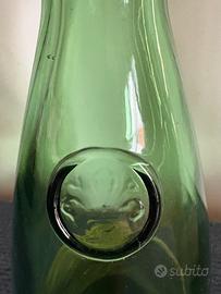 splendida coppia di caraffe vintage da osteria, autentici pezzi di design rustico italiano degli anni '50. Realizzate in vetro soffiato verde smeraldo, queste bottiglie presentano la classica linea svasata tipica dei decanter per vino sfuso. Le caraffe presentano un elegante sigillo in rilievo sul collo, tipico delle produzioni toscane/empolesi dell'epoca. Il vetro non presenta crepe o sbeccature; il rivestimento in corda è ben conservato e solido.
