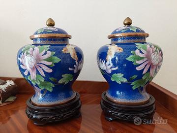 coppia di vasi in metallo con decoro floreale eseguito con la tecnica cloisonnè (smaltatura su metallo) in condizioni pari al nuovo