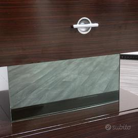 La parte superiore è completata da un piano in vetro specchiato, perfettamente integrato nella sagoma del mobile e ideale per valorizzare la texture scura e lucida dell’ebano. Le maniglie in acciaio donano un tocco modernista e bilanciano armoniosamente il disegno pulito dell’insieme.