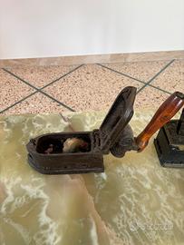 Lotto composto da due rari ferri da stiro d'epoca in ghisa pesante, testimonianza autentica dell'arte popolare del primo Novecento. Entrambi i pezzi presentano il corpo cavo originale destinato a ospitare le braci ardenti, con aperture laterali per la ventilazione e coperchi apribili tramite perno. Il ferro principale è caratterizzato da un elegante manico in legno sagomato e decorazioni traforate sul coperchio, mentre il secondo modello mostra una struttura robusta con interno ancora completo di griglia originale. Gli oggetti conservano la loro patina storica naturale, che ne esalta il carattere vintage e industriale. Perfetti come ricercati fermalibri, soprammobili per ambienti rustici o pezzi da esposizione per collezionisti di oggettistica antica.