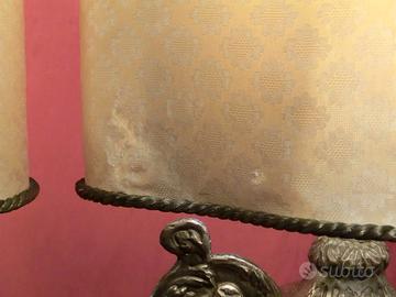 Descrizione: Coppia di importanti lampade da appoggio realizzate mediante l’utilizzo di eleganti portapalme settecenteschi in rame argentato, caratterizzati da un raffinato repertorio decorativo a motivi vegetali e volute, di gusto pienamente barocco. I portapalme, originariamente concepiti come elementi ornamentali liturgici o d’arredo, sono stati successivamente adattati a uso illuminotecnico tramite un intervento di elettrificazione rispettoso delle proporzioni e dell’estetica originaria. Le lampade sono completate da paralumi di grandi dimensioni con anima rigida, rivestiti in seta color champagne dorato, che contribuiscono a una diffusione della luce calda ed elegante, valorizzando il pregio materico delle basi metalliche.