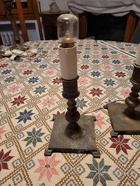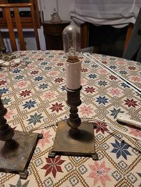 Coppia di lampade da comodino / abat jour, ricavate da portacandele. Altezza: 18 cm circa (senza lampadina). Le lampade sono funzionanti. Il prezzo si riferisce alla coppia di lampade.