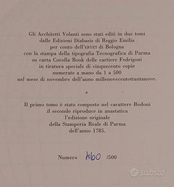 Coppia di volumi storici sulla mongolfiera. Edizioni Diabasis, 1990 Edizione a tiratura limitata copia n. 460 su 500. I due volumi, di grandi dimensioni (25 x 38) sono in un cofanetto editoriale cartonato. Volume I: I voli della ragione, Valter Rosa. Volume II: Relazione della macchina aereostatica, Agostino Gerli. Anastatica dell'edizione originale del 1785 della Stamperia Reale di Parma. I libri sono in ottime condizioni.