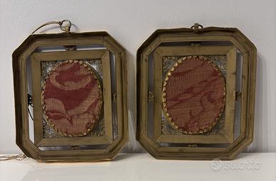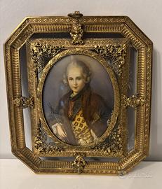 Coppia di miniature d'arte raffiguranti ritratti di nobili in costume d'epoca in stile settecentesco, probabilmente del XIX secolo, dipinte a mano e inserite in cornici ottagonale decorative in ottone Rococò/Luigi XV con dettagli traforati. Larghezza cm 12,5 altezza cm 14 peso gr. 292
