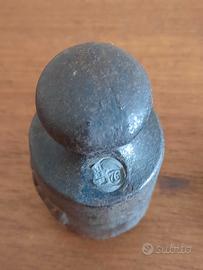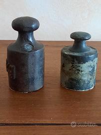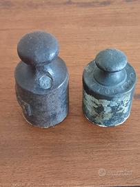 Due pesi in metallo: uno da 0.5 Kg punzonato e uno di peso non segnato. Ideali per collezionisti o come elementi decorativo. Segni del tempo, finitura grezza e vissuta. - Peso da 0.5 Kg con indicazione 0.5 Kg incisa. - Peso senza indicazione.