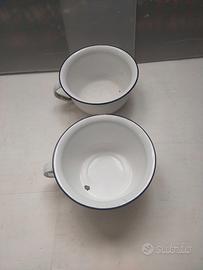 Vendo in blocco coppia di pitali in metallo smaltati bianco-blu, marca "I Due Leoni", risalenti agli anni '60, in buono stato di conservazione malgrado qualche fisiologica ammaccatura e relativa ossidazione dovuta al loro utilizzo nel tempo ma comunque ancora perfettamente utilizzabili. Spedizione con pacco unico bene imballato al fine di preservare il contenuto.