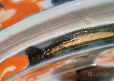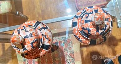 Coppia di potiches in porcellana dipinta. Corpo a sezione circolare dalla forma panciuta e costolata sormontato da coperchio con presa a fogaia di pigna Ricchi decori floreali nei colori blu cobalta sottocoperta, mattone e oro sopracoperta I coperchi sono incollati alla base Giappone, manifattura lmari, epoca Meiji (1868 - 1912) 31 cm altezza.
