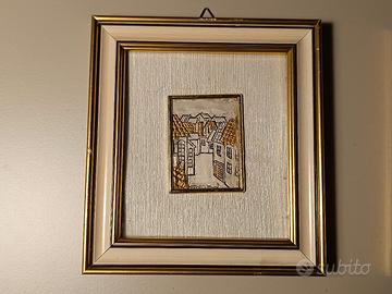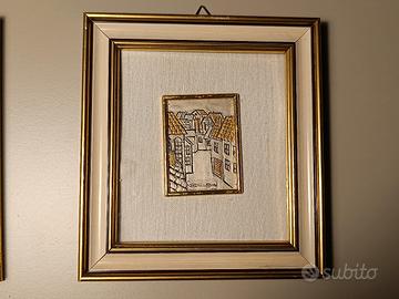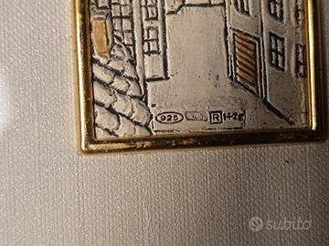 Vendo splendida coppia di quadretti decorativi, anni 80, realizzati con lamina in argento 925 e finiture in oro. Le opere raffigurano scorci di un borgo antico, lavorati a rilievo con grande cura. Questi pezzi sono perfetti per chi ama l'eleganza classica o per chi cerca un'idea regalo di valore e raffinata. Lo stile dei soggetti e le cornici chiare con profili dorati li rendono facilmente inseribili sia in un arredamento classico che moderno. Caratteristiche principali: Materiale: Argento 925 (punzone visibile nelle foto) con dettagli dorati. Soggetto: Architettura urbana/Borgo antico a rilievo. Dimensioni: Altezza 14 cm x Larghezza 13 cm. Stato: Ottime condizioni, pronti per essere appesi. Cornice: Elegante cornice con passepartout in tessuto che valorizza il contrasto con l'argento. Per ulteriori foto e informazioni non esitate a contattarmi