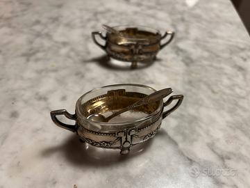 Vendo elegante coppia di saliere d’epoca (saleron) in silver plate, complete di inserti rimovibili in vetro e cucchiaini originali.