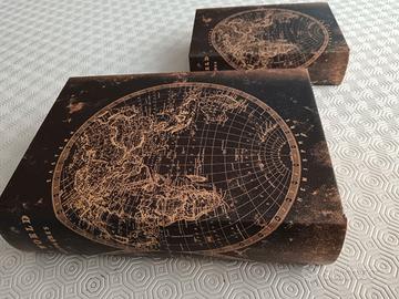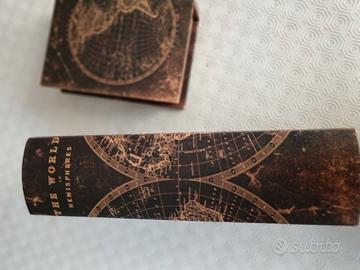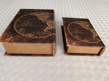 Una curiosa coppia di scatole vintage a forma di libro, con stampa a mappamondo, di gusto nautico. Sono rivestite internamente in velluto. Due oggetti curiosi e belli come portaoggetti da tavolo.