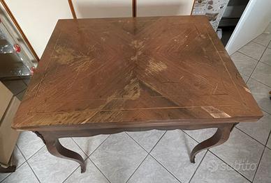 Elegante coppia di sedie con cuscini sfoderabili e tavolo estensibile con cassetto. Stato: da restaurare. Non effettuo spedizioni.