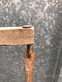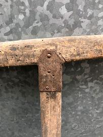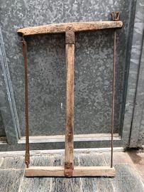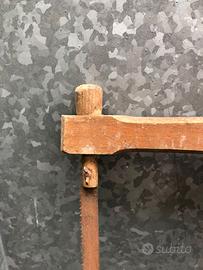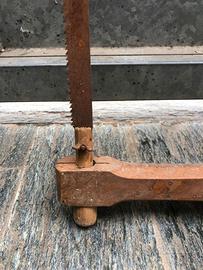 Coppia di seghe a telaio antica (o sega ad arco), un attrezzo tradizionale utilizzato in falegnameria e carpenteria per il taglio del legno. Struttura: È costituita da un telaio in legno composto da due traverse collegate da un asse centrale (staggio). Funzionamento: La lama, dentata e in ferro, è tesa tra le due estremità del telaio grazie a un sistema di tensione composto da una corda e una nottola in legno. Utilizzo: Veniva impiegata per segare legna di vario diametro o per lavori di precisione, a seconda della dimensione e del tipo di lama montata. Dimensioni : entrambe 850 mm x 450 mm Oggetto da restaurare per piacere oppure come arredamento rustico