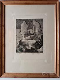 Una coppia en pendant di stampe artistiche da collezionismo, firmate e datate, ideali per regalo aziendale o di matrimonio. Una è firma non è chiara, la seconda è Mario Guadagnino. Entrambi docenti di incisione presso l’Accademia di Belle Arti di Venezia negli anni 1970.
