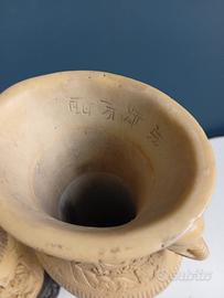 Coppia di Vasi biansati in resina con motivi intagliati a tema orientale con