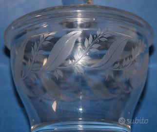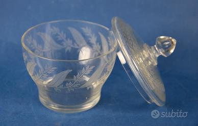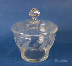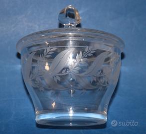 1) Vecchio vaso contenitore porta bonbon in cristallo trasparente lavorato a satinatura di contrasto, con motivi silvestri e corone. Coperchio amovibile.