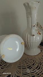 Coppia Artistica di Vase in Porcellana Bianca e decoro in Oro. Rose in Alto rilievo, Corpo bombato con strisce in rilievo. Alte 23 cm e Base diametro