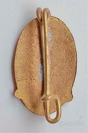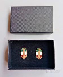 Estremamente rara coppia di distintivi d’epoca fascista del P.N.F. ovvero il Partito Nazionale Fascista di “primissimo” tipo (1921) nella doppia versione da indosso dei quali uno con al verso la spilla e l’altro con piedino per asola da giacca. Gli “straordinari” cimeli, conservati in elegante scatola “di gioielleria” in cartone pressato di colore blu notte, sono stati realizzati in metallo dorato e smalti policromi ed in particolare essendo coevi tra loro, presentano il medesimo disegno e cioè un fascio “primigenio” repubblicano di tipo “squadrista” posto su uno sfondo con tricolore “orizzontale” (quest’ultimo usato esclusivamente per i “primissimi” tipi di questi distintivi giacché poi muterà in disposizione “verticale”) con ai piedi i nastri. L’affascinante lotto si presenta in "OTTIME" condizioni di conservazione in tutti i suoi componenti “genuini” ed “intonsi”, ancora in “rigorosa” patina d’epoca, senza mancanza, rottura e/o difetto alcuno. Misure: 20 mm x 12,5 mm (cadauno).