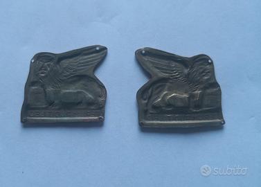 Vendo rara coppia di fregi metallici originali d'epoca (Seconda Guerra Mondiale), appartenuti a reparti della Fanteria di Marina (Reggimento San Marco / Decima MAS). I fregi raffigurano il Leone di San Marco con libro chiuso e il motto "ITERUM RUDIT LEO" (Di nuovo ruggisce il leone). Caratteristiche del lotto: Tipologia: Variante da cucire (presenti i 4 fori originali agli angoli per l'applicazione sulla divisa). Materiale: Ottone/Bronzo stampato con tracce della smaltatura rossa originale sul fronte. Stato di conservazione: Eccellente patina del tempo, metallo integro senza crepe o deformazioni. Il retro mostra la classica lavorazione in negativo della stampa d'epoca. Autenticità: 100% originali, non sono riproduzioni moderne. Pezzi ideali per collezionisti di militaria della Regia Marina, RSI o per completare il restauro di una giubba storica.