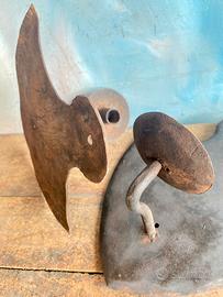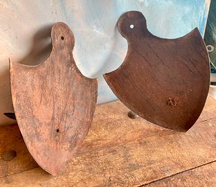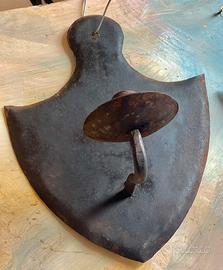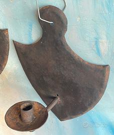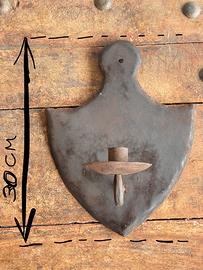 Due bellissimi scudi in ferro vecchio, porta candele da appendere al muro . Coppia uguale vintage particolare , rari porta candele a sbalzo in ferro battuto. Arredamento per case rustiche , cascina, portico o locali pubblici. Dalla forma particolare belli da vedere. In buone condizioni, Facili da appendere. candle holder . Spedizione disponibile .