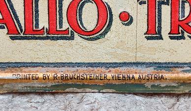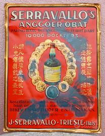 coppia insegne in metallo anni - Serravallo vino di china Trieste, alt 43,5 cm. largh. 33 cm. un po' vissute usurate come da foto. campagna pubblicitaria per C l' Oriente, stampate a Vienna.