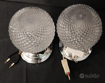 Coppia di lampade da tavolo vintage databili agli anni ’70, caratterizzate da diffusori sferici in vetro a motivo diamantato che creano splendidi giochi di luce una volta accese